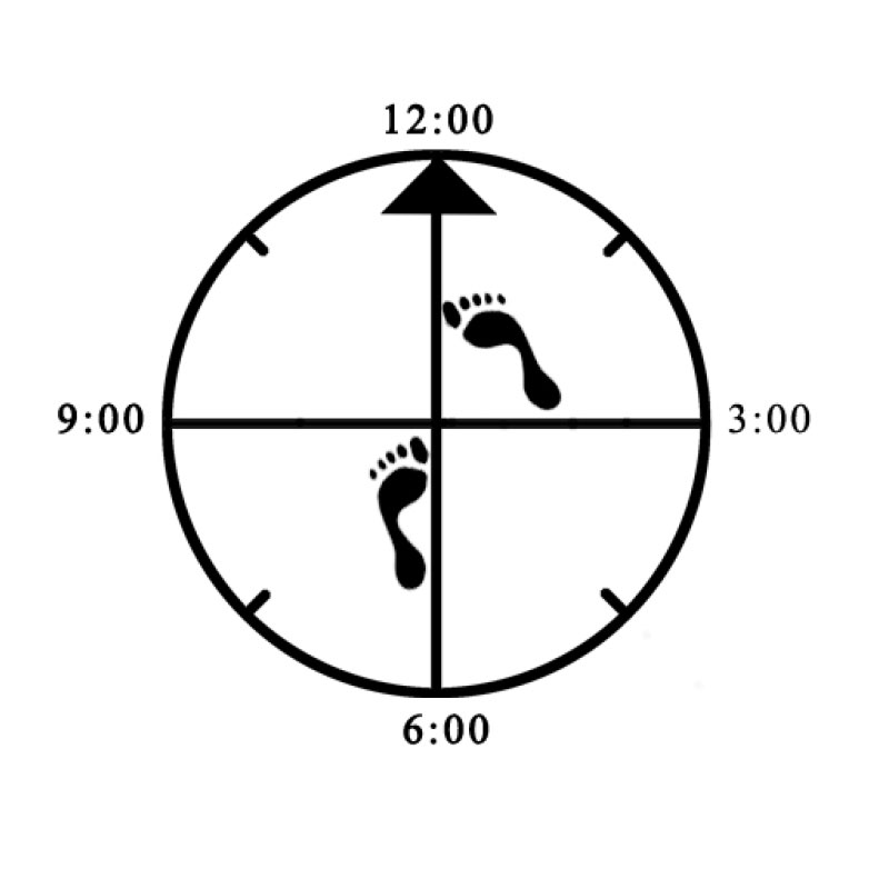 | i) | feet = front foot forward at 45 degree angle - rear foot directly forward |